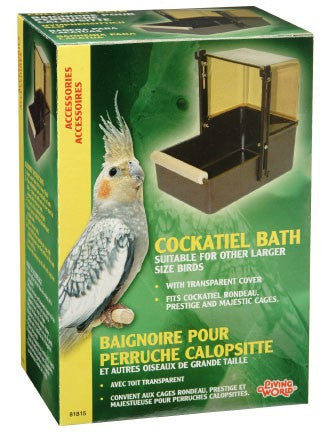 The transparent cover will allow you to see your bird play in the water, contain splashing, and protects the bird from drafts. Designed with a durable wooden perch, the bath is easy to assemble and clean. The adjustable plastic hooks mount vertically on both sides of the cover, and the stabilizing studs on the bottom of the bath are designed to firmly secure the bath. 81815, Brown base with clear topaz cover