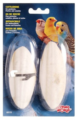 Derived from natural cuttlefish, Living World® Cuttlebone provides natural calcium and minerals that are essential to caged birds. The hard, natural surface keeps beaks trim and sharp. The package includes a cage holder for easy installation. For parakeets, finches, and canaries. Size: Small (12.5 cm/5 in). 2-pack.