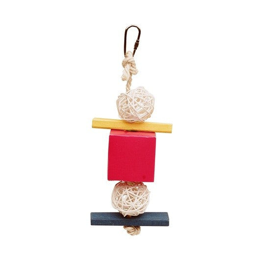 Why not add Tropican morsels for extra foraging fun? This particular toy has 2 vine balls, 2 colored wooden bars and 1 paper box, all securely held together by a rope.