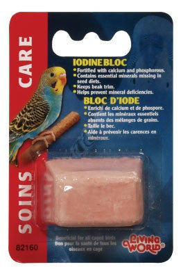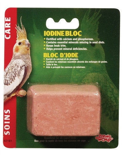The Living World Iodine Bloc helps prevent mineral deficiencies. Fortified with calcium and phosphorous, the block contains essential minerals missing in seed diets. The Iodine Bloc provides iodine, which is vital to birds, and helps keep the beak trim. The block has metal twist ties moulded into the back so the block can easily be attached to any cage. Available in 2 sizes; Small and Large.