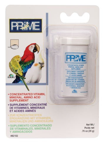 Prime - The best way to ensure total nutrition for all cage birds. Concentrated full spectrum vitamin, mineral and limiting amino acid supplement. Years of formulating and field testing have resulted in the most advanced avian supplement. Prime has excelled above all other supplements in providing all species of companion birds with their required nutrients. The ingredients in Prime were selected strictly on the basis of need. This results in higher levels of those nutrients truly needed by birds. For most accurate dosage and administration, we recommend Prime be sprinkled over your bird's favorite fruits and vegetables. It also makes a great additive to egg and nesting food. FEATURES AND BENEFITS Ultra fine, highly palatable powder does not cake over time Penetrates soft foods for accurate dosage administration Contains 14 vitamins and 9 minerals missing in most seed/vegetable/fruit diets Extra vitamin C and E for increased breeding and as antioxidants Calcium gluconate carrier adds required calcium which is deficient in most other supplements Exotic fruit flavoring without added sugar which can promote pathogenic organisms Lysine and Methionine amino acids improve diet protein quality Unique combination of enzymes and acidifiers to improve digestion Micro-encapsulated Beneficial Bacteria (Probiotics) keep birds in top condition.