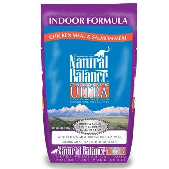 Natural Balance® Indoor Ultra Chicken Meal & Salmon Meal Premium Formula Cat Silver Sealtargets the unique needs of indoor cats. Lower levels of protein and fat (compared to our Original Ultra® Ultra Premium Formula) combined with wholesome ingredients like chicken meal, brown rice, oatmeal and potatoes, provide a balanced blend of nutrition and function.