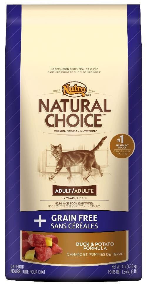 Help reduce the likelihood of food sensitivities in your cat. NATURAL CHOICE® GRAIN FREE Adult Cat Duck & Potato Formula is specially designed for cats that are sensitive to certain grains. This formula is designed with 0% grain and is fortified with a high level of omega fatty acids for healthy skin and soft fur. Advanced antioxidants help support your cat's immunity, and best of all, nutrient-rich, non-grain carbohydrates provide all-day energy and help aid digestion. Your cat will enjoy the taste of real duck and that it's gentle on their sensitive system.