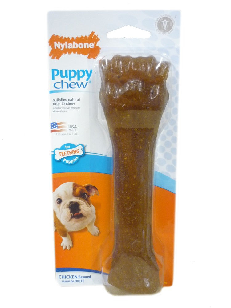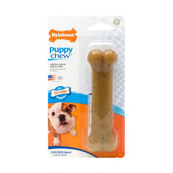 The Nylabone Puppy bone is made from inert soft thermoplastic polymer to satisfy the chewing instinct of teething puppies. The chicken flavoured Puppy bone encourages non-destructive chewing. Bristles raised during chewing will help clean teeth, and prevent tartar build up. Designed for teething puppies - Not recommended for adult dogs, or puppies with any permanent teeth. Available in 2 sizes: Wolf (suitable for medium puppies), and Souper (suitable for medium and large puppies).